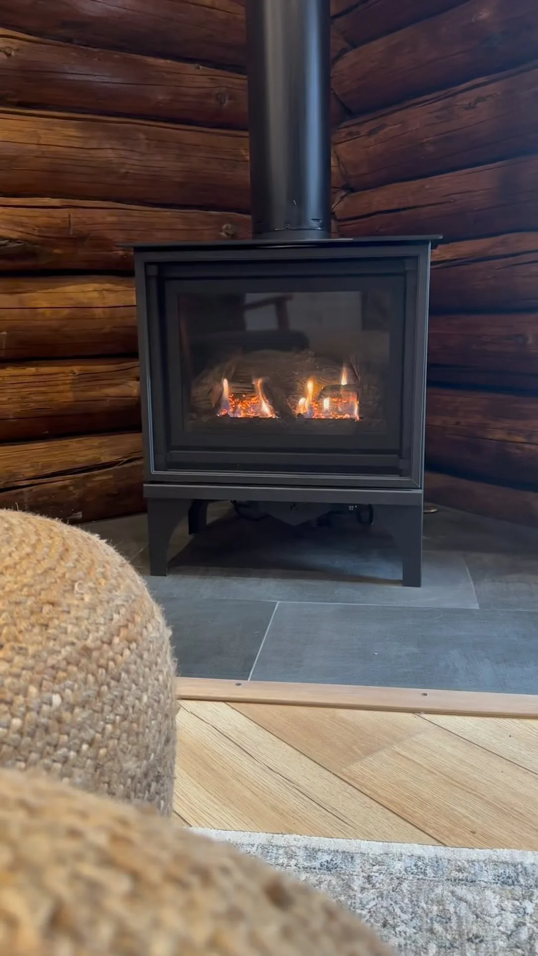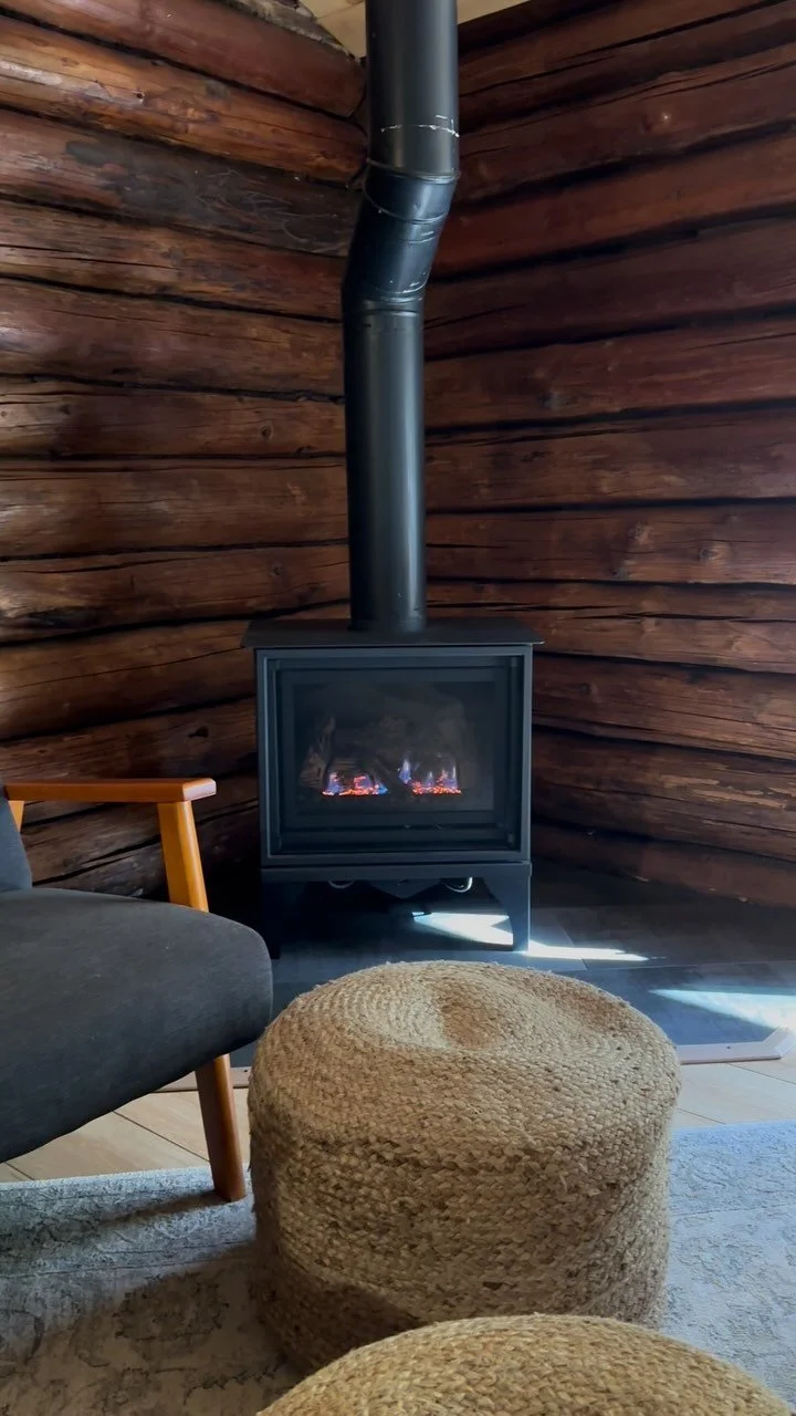 Enjoy a warm gas stove, comfortable seating, and a beautiful view of the wooded hill